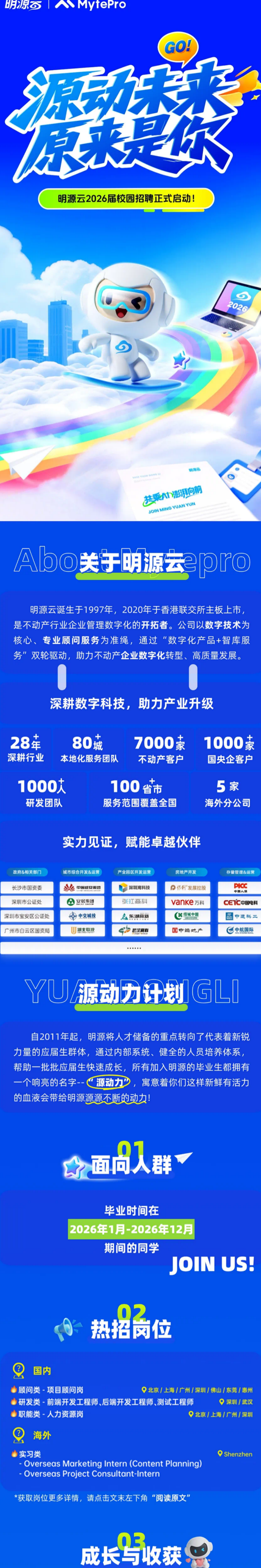 公司介绍:明源云是深圳数字科技企业,助力产业升级,实力强劲,合作众多头部品牌,获多项行业荣誉。